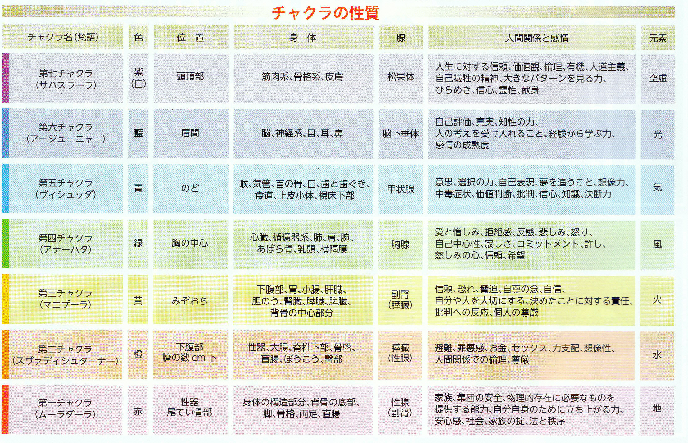 各チャクラを活性化することで下記表の要素も活性化されます。